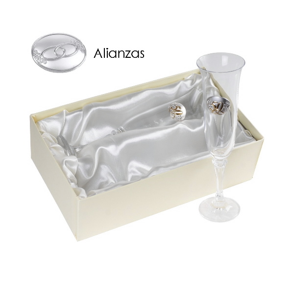 ¿Tus mejores amigos han decidido intercambiar anillos y comprometerse celebrando su Boda? Sorpréndelos en este día tan especial con este lujoso estuche de Copas realizadas en cristal de Bohemia y decoradas con un elegante aplique bilaminado con dos alianzas.