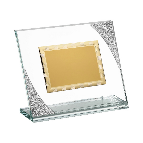 Un recuerdo elegante y tradicional ofrece esta placa de cristal decorada y chapa de aluminio dorada para la conmemoración de eventos o fechas significativas ofreciendo un reflejo fiel del motivo de su celebración.