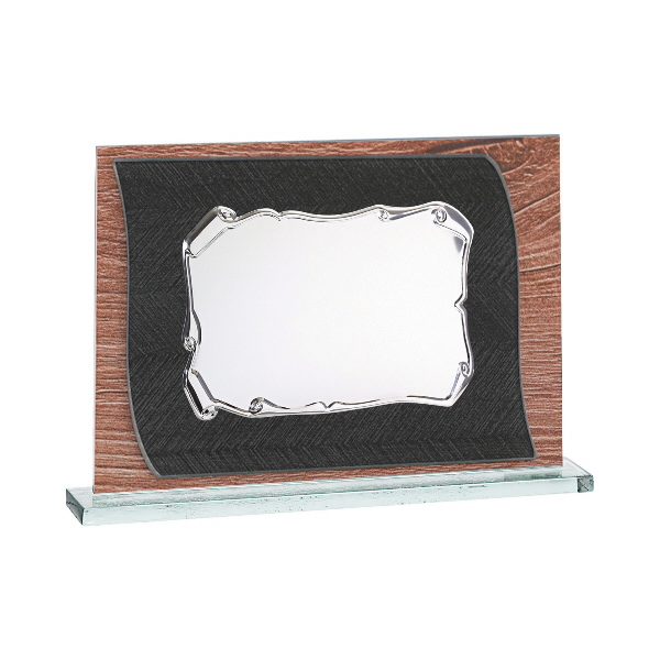 Un recuerdo elegante y tradicional ofrece esta placa de cristal con lámina imitación madera en dos tonos y chapa de aluminio para la conmemoración de eventos o fechas significativas ofreciendo un reflejo fiel del motivo de su celebración.