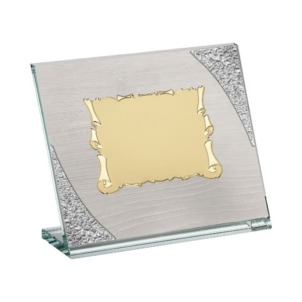 Un recuerdo elegante y tradicional ofrece esta placa de cristal decorado, con lámina imitación madera plateada y chapa de aluminio dorada para la conmemoración de eventos o fechas significativas ofreciendo un reflejo fiel del motivo de su celebración.