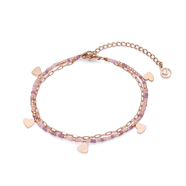 Tobillera Viceroy realizada en acero quirúrgico y cuentas de cristal en elegantes tonos de rosa, con corazones rosados. Añade un plus de color y elegancia a tus tobillos, combinándola con tus sandalias favoritas.